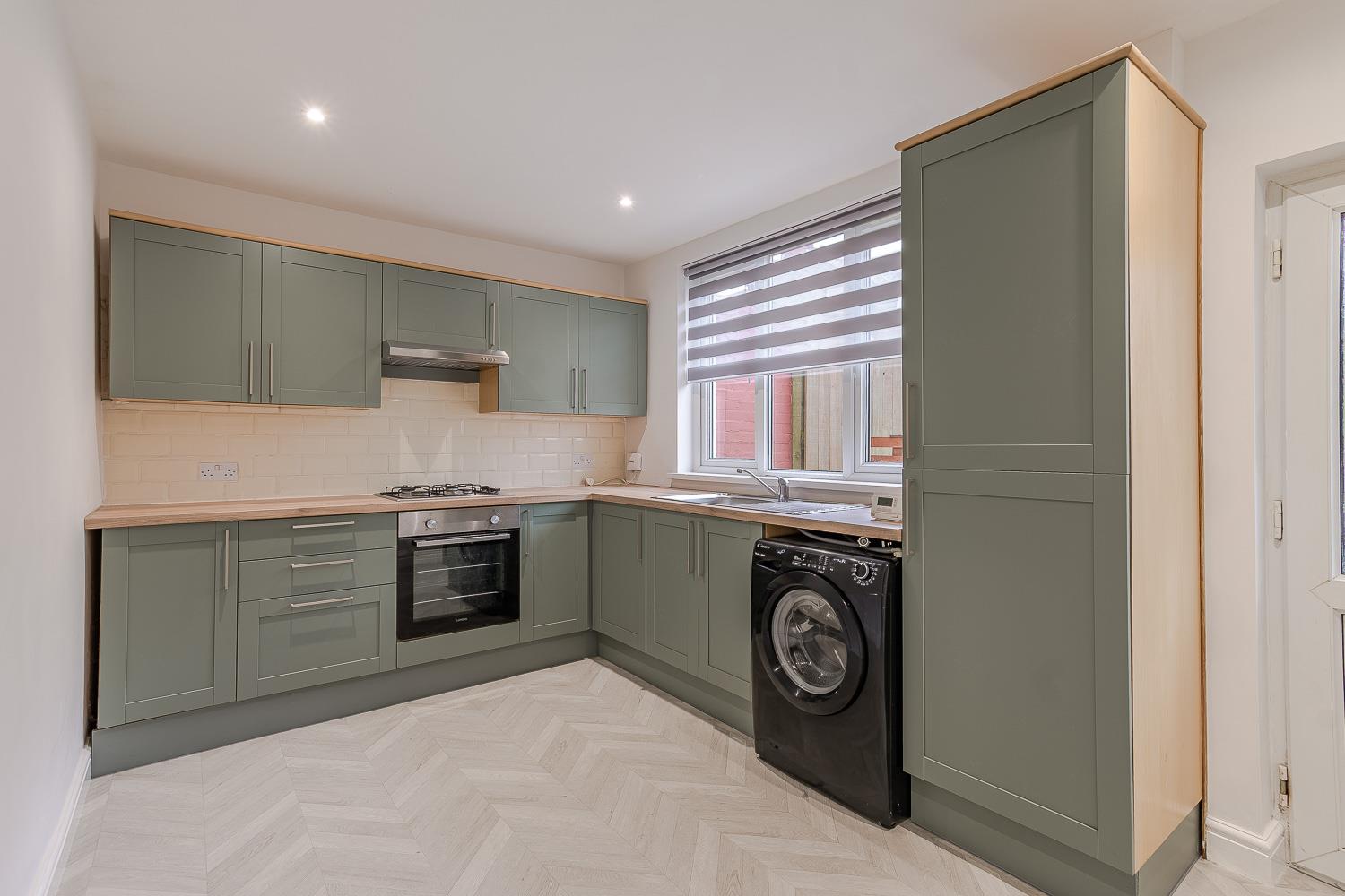Plastered ceiling with inset spotlights, plastered walls, and herringbone-style vinyl flooring. Access to the rear garden is provided through a UPVC double-glazed obscure glass door, with an additional UPVC double-glazed window overlooking the garden. The upgraded kitchen is fitted with shaker-style high-level wall units, a selection of base units with drawers, and wood-effect work surfaces. It includes a stainless steel sink with a mixer tap, plumbing for a washing machine, an integrated Lamona oven and grill, a four-ring Lamona gas hob integrated into the worktop with an extractor fan above, and Metro-style ceramic splashback tiles. The room also contains a radiator, space for a fridge freezer, and an enclosed wall-mounted combination boiler.