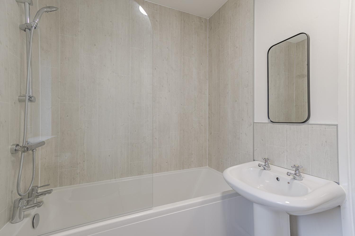 Plastered ceiling, plastered walls, and non-slip vinyl flooring. It includes a close-coupled toilet, a replacement bath with twin taps and a mains-operated renewed shower over, a pedestal wash hand basin with twin taps, an extractor fan, a wall-mounted radiator, and a UPVC double-glazed obscure glass window overlooking the rear garden.