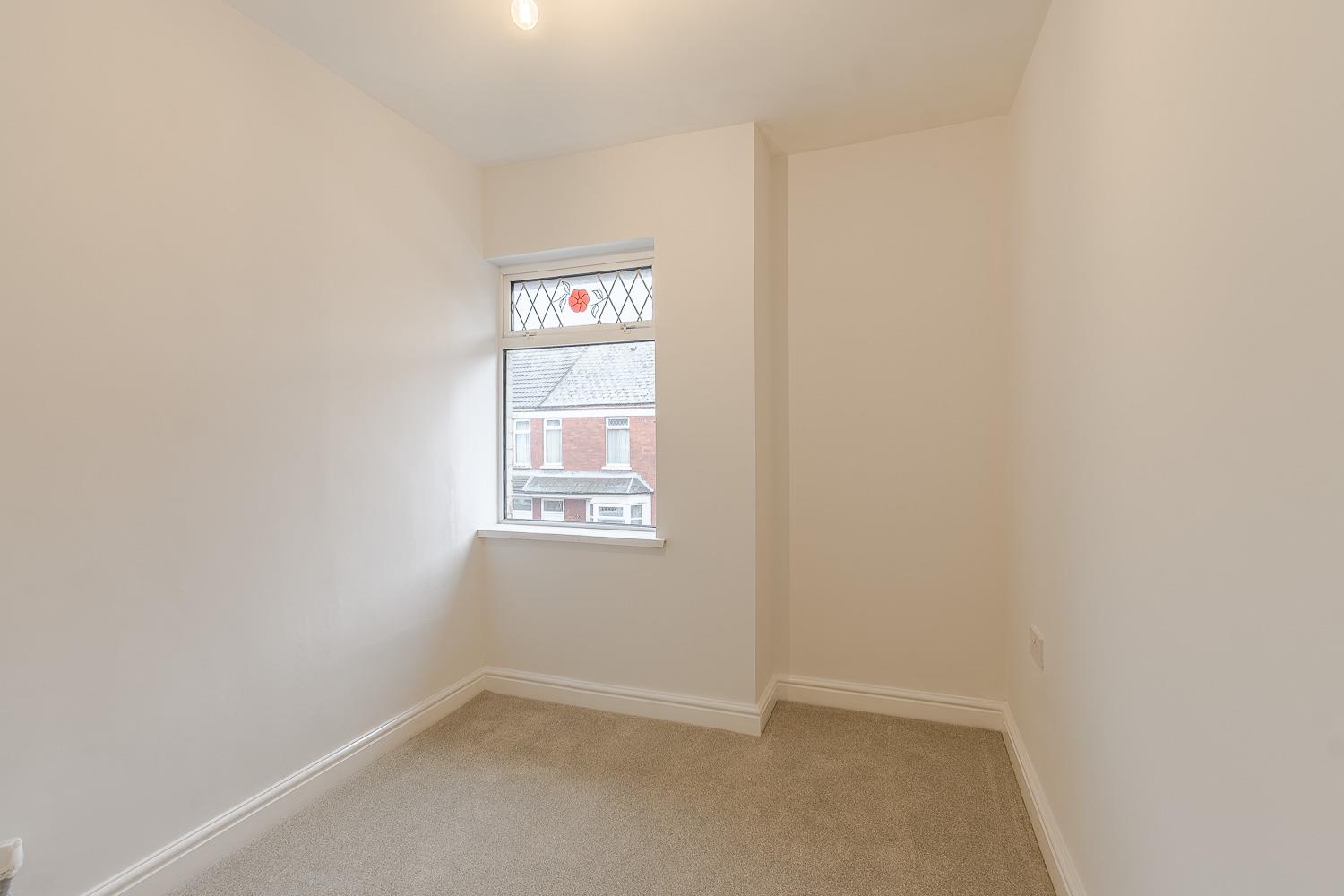 plastered ceiling, plastered walls, and carpet flooring. It contains a radiator and a UPVC double-glazed window overlooking the rear elevation.
