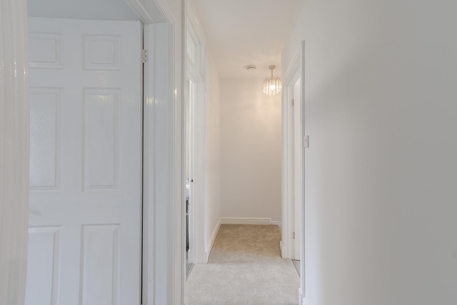 Plastered ceiling, plastered walls, and fitted carpet flooring. It provides loft access and has wooden doors leading to the bedrooms and the family bathroom.