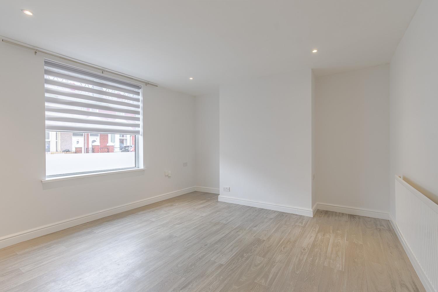 Plastered ceiling with inset spotlights, plastered walls, and wood-effect vinyl flooring. A wall-mounted radiator and a UPVC double-glazed window overlooking the front elevation are present, along with a door leading to the kitchen.