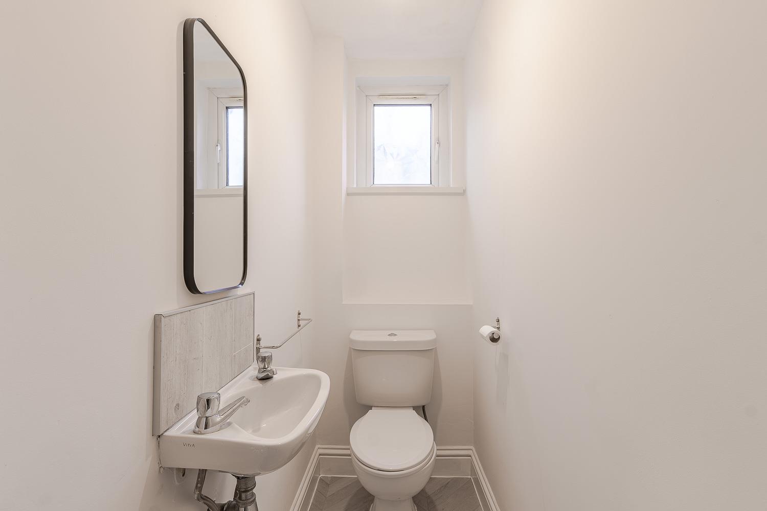 Plastered ceiling, plastered walls, and a continuation of the herringbone vinyl flooring. It contains a close-coupled toilet, a wall-mounted wash hand basin with twin taps, and a UPVC double-glazed obscure glass window overlooking the rear.