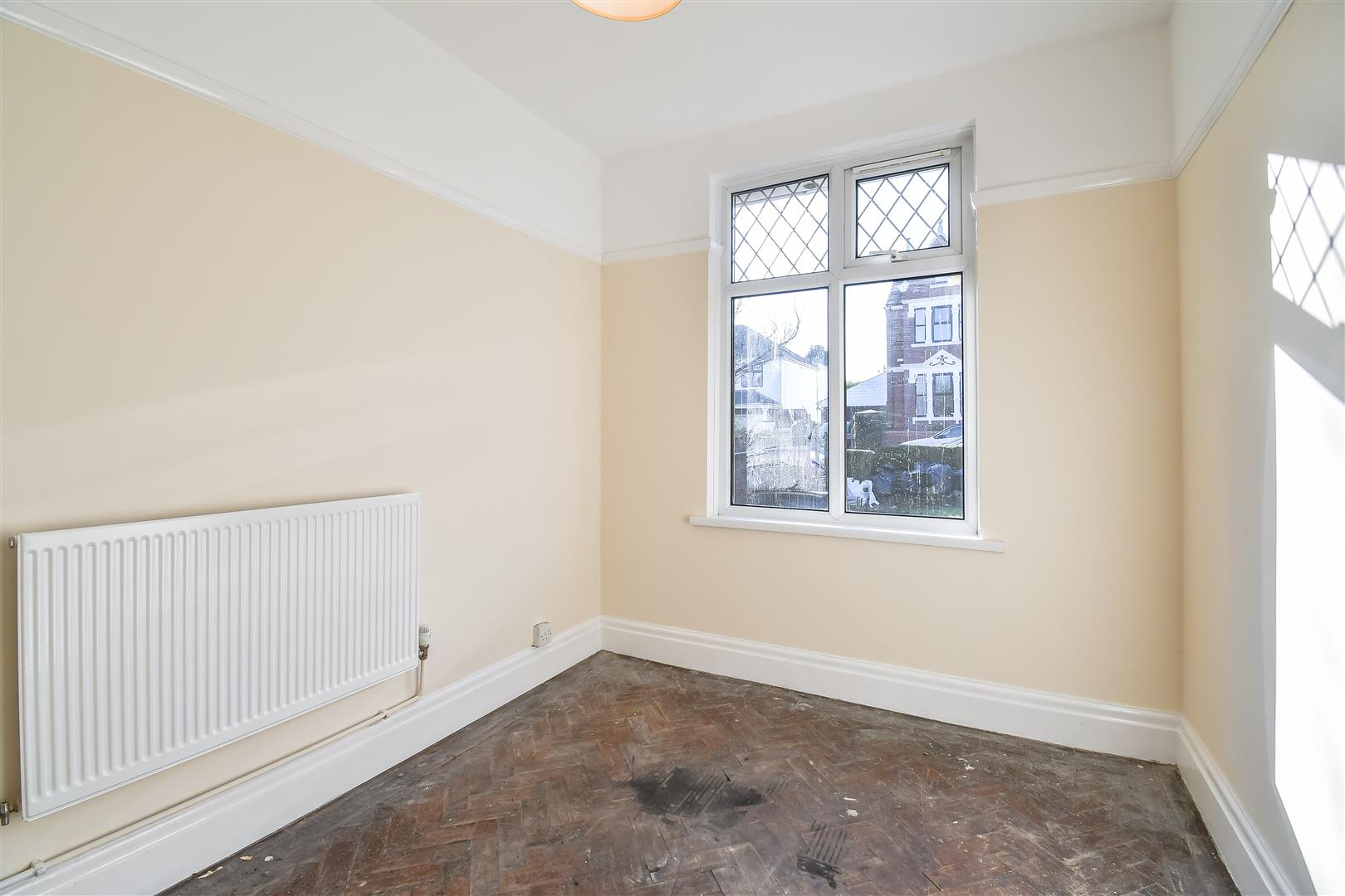 Papered ceiling, papered walls. Fitted carpet flooring (original parquet flooring underneath). Wood panelled doors leading to bedroom two, and living / dining room. Original wood panelled door with obscured glass insert leading to the storm porch.