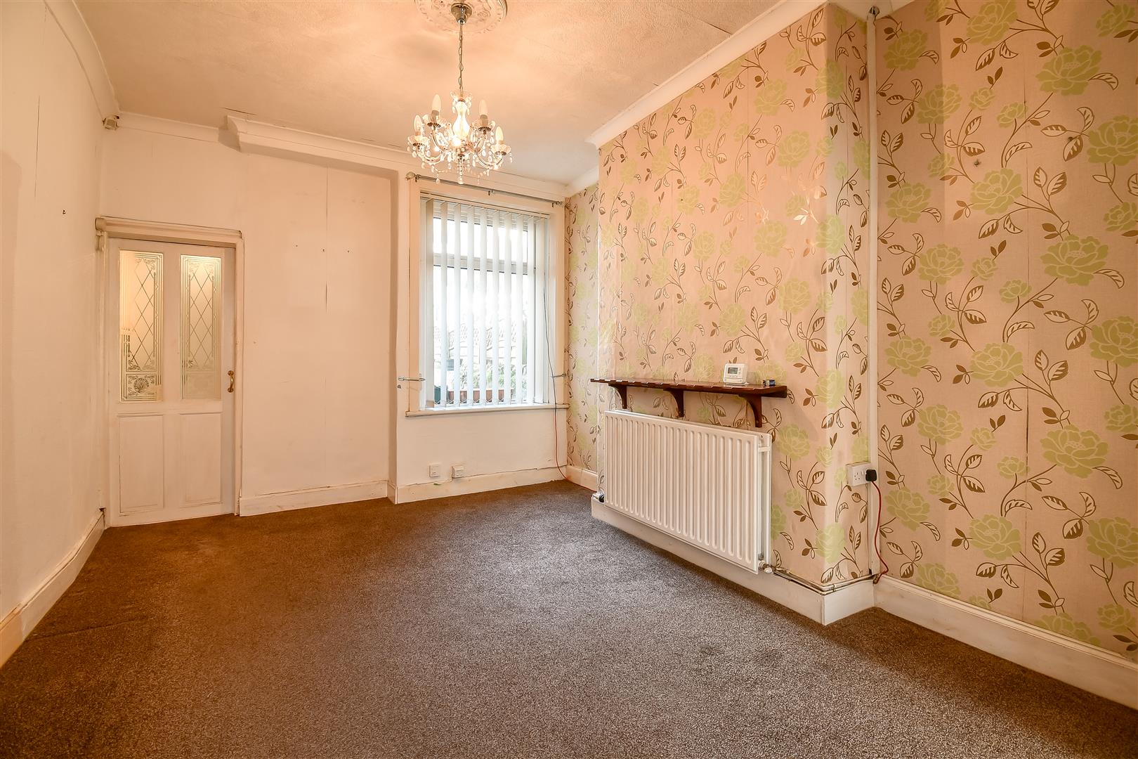 Papered ceiling with coving, papered walls. Fitted carpet flooring. Wall mounted radiator. UPVC double glazed window to the rear elevation. Through opening to living room. Wood sliding door leading through to kitchen.