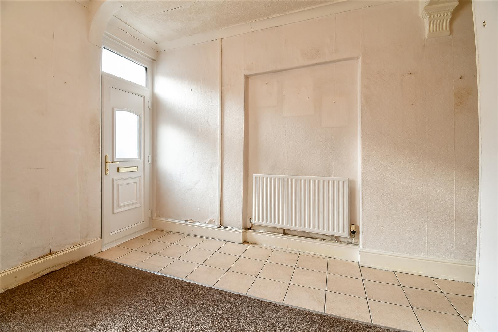 Paper ceiling with coving, papered walls. Ceramic tiled flooring. Wall mounted radiator. UPVC double glazed front door with obscured glass insert and skylight. Through opening to living / dining room. Fitted carpet staircase rising to the first floor.