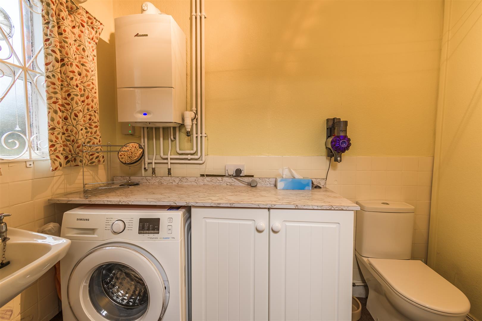 Papered ceiling with coving, papered walls. Fitted carpet flooring. Wall mounted radiator. Aluminium Framed window with obscured glass to the site elevation. Base units. Wood laminate worktop. Space for washing machine. Pedestal wash hand basin, close coupled toilet. Wall mounted combination boiler. Wood framed door leading through to the kitchen.