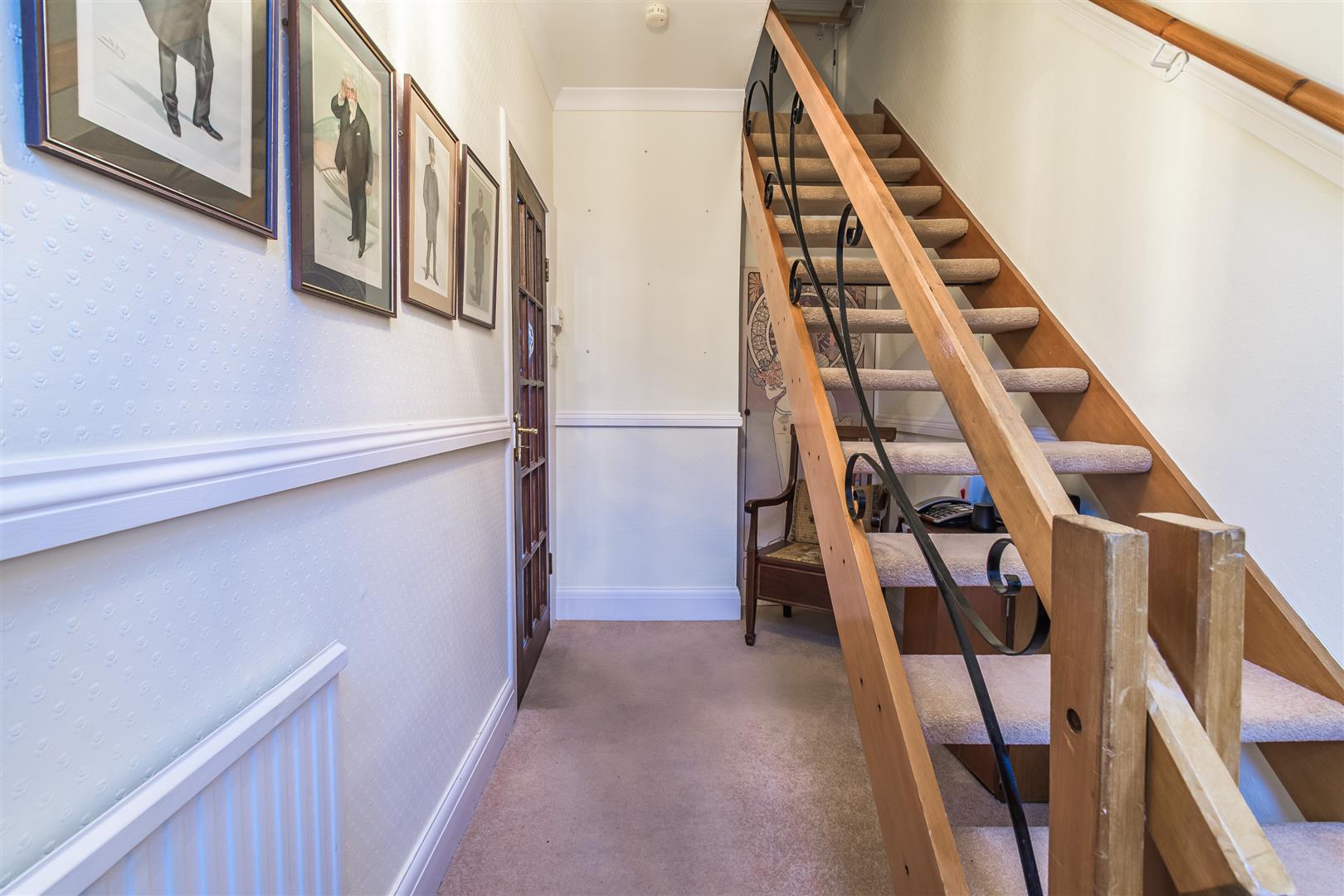 Smoothly plastered ceiling with coving, papered walls with dado rail. Fitted carpet flooring. Wall mounted radiator. Fitted carpet staircase rising to the first floor. A stained-glass window. UPVC double glazed front door with obscured glass insert and skylight. Access to understairs storage. Wood framed door with glass insert leading through to the living / dining room.