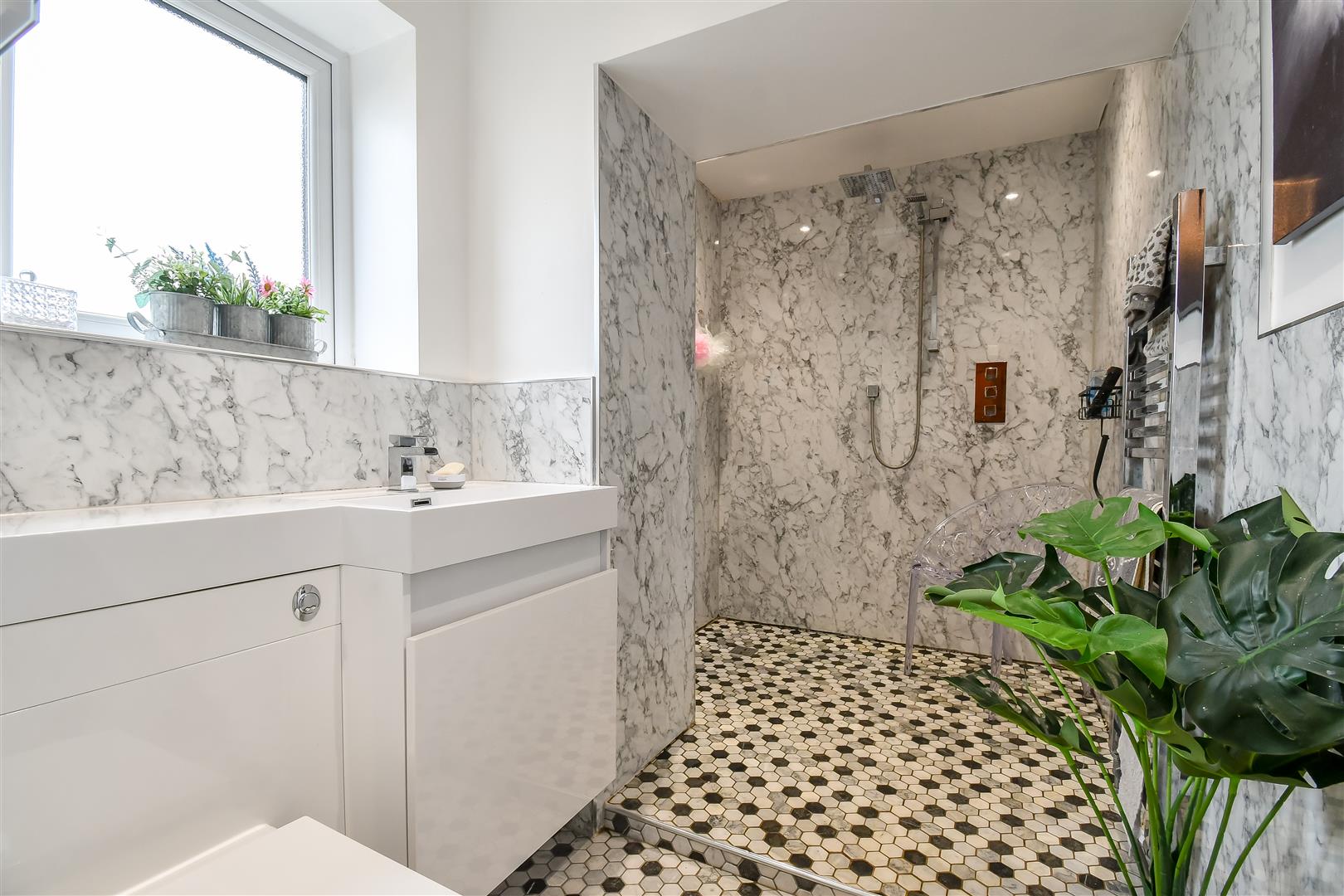 Smoothly plastered ceiling with inset lights and vent extractor. PVC panelling to walls. Mosaic ceramic tiled flooring. Wall mounted towel rail. UPVC double glazed window with obscured glass to the side elevation. Vanity wash hand basin. Vanity toilet. Walk in double rainfall shower. Wood panelled door leading through to the entrance hallway.