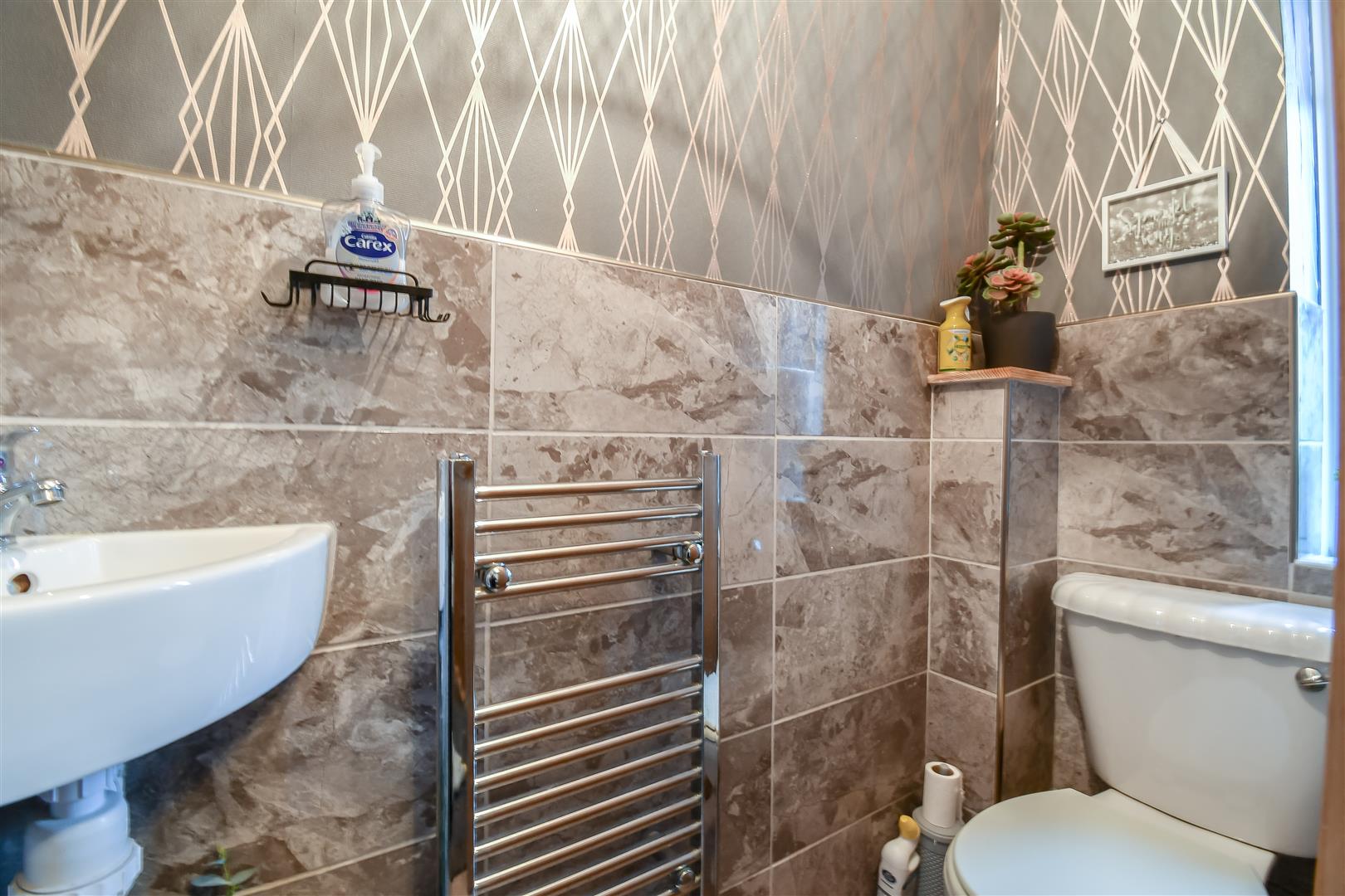 Textured ceiling, papered walls. Porcelain tiled splashback. Ceramic tiled flooring. Wall mounted towel rail. UPVC double glazed window with obscured glass to the side elevation. Pedestal wash hand basin. Corner sink. Wood panelled sliding door leading to the first floor landing.