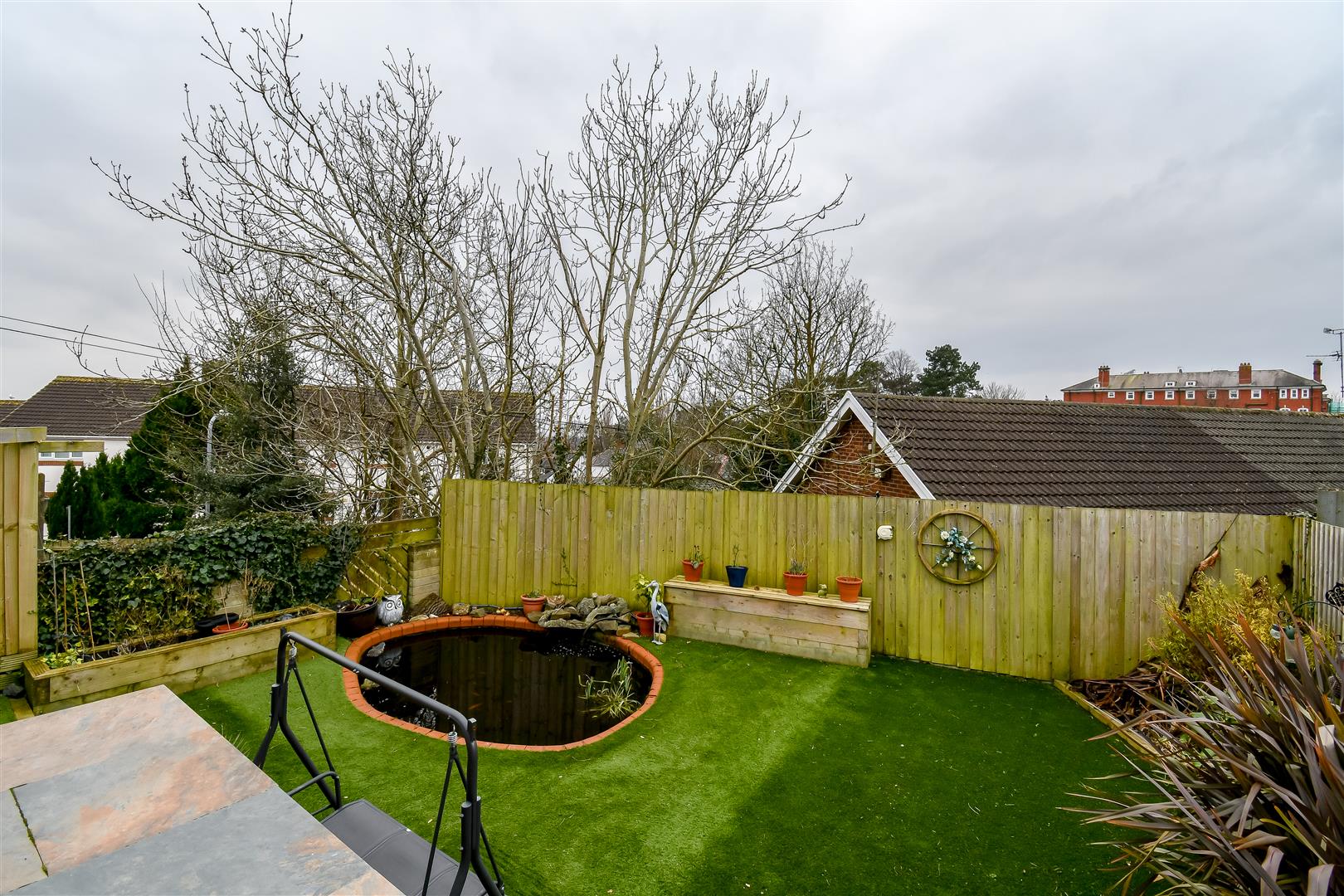 Enclosed rear landscaped garden. Laid Astro turf lawn. Raised Sleepers with planted establish shrubbery. Pond. Power and lighting. Steps Ascending to a sandstone paved terrace area with bi - folding doors leading to the dining / sitting area. Pergola area with further Astro turfed lawn to the side. Storage under raised terrace. Double wooden gates to front.