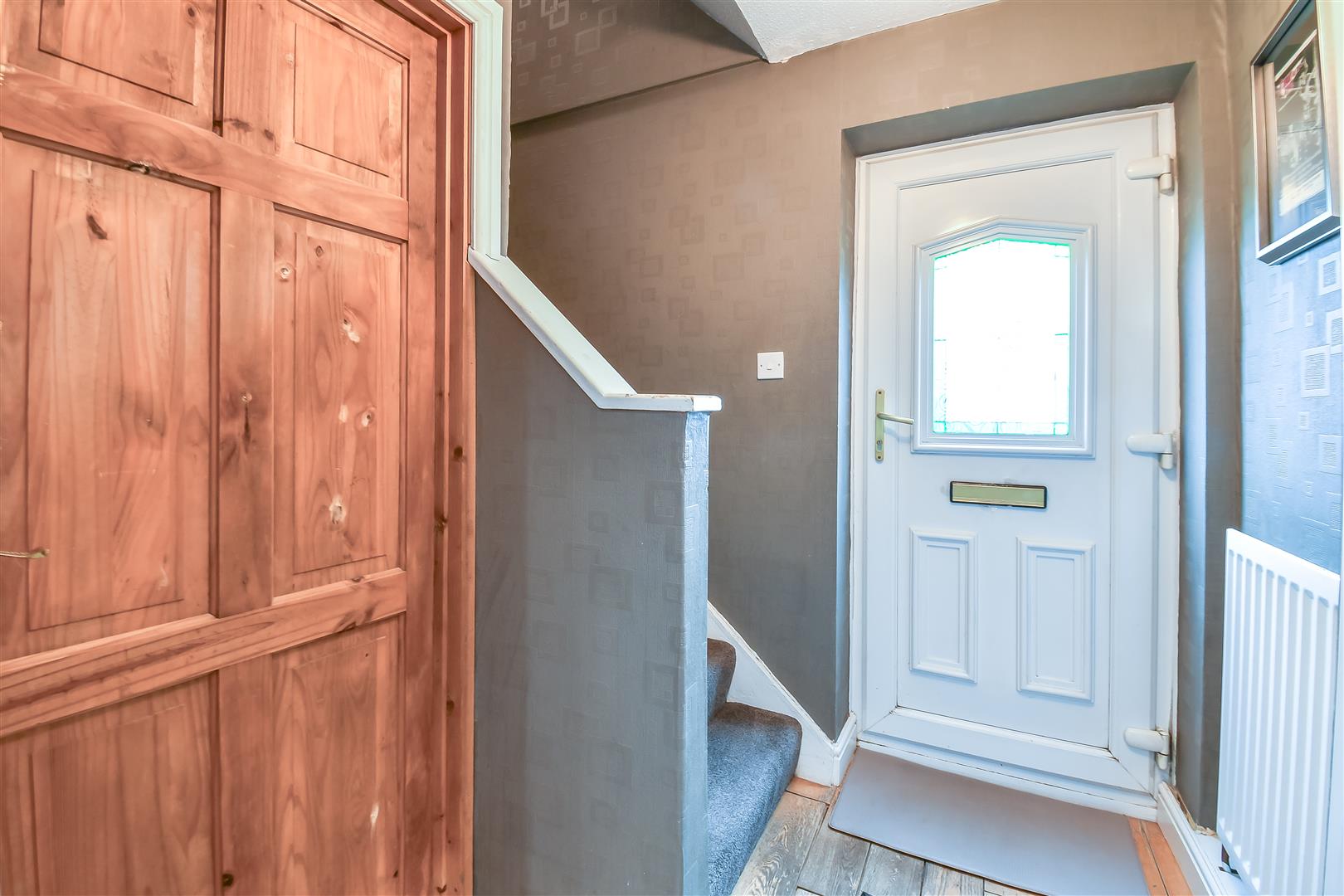 Enclosed front garden, steps ascending to a laid to lawn. Further steps ascending to a UPVC double glazed front door. Side access to rear via wooden double gates.