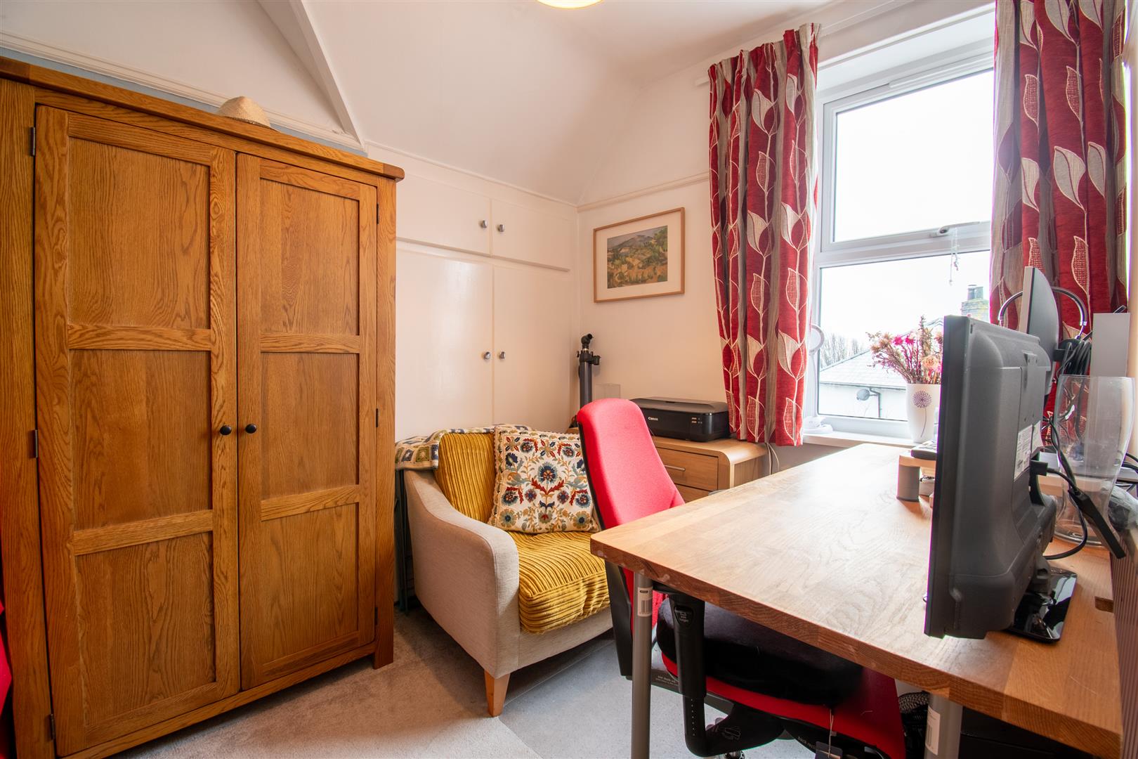 Smoothly plastered ceiling, papered walls. Fitted carpet flooring. Wall mounted radiator. UPVC double glazed window to the front elevation.