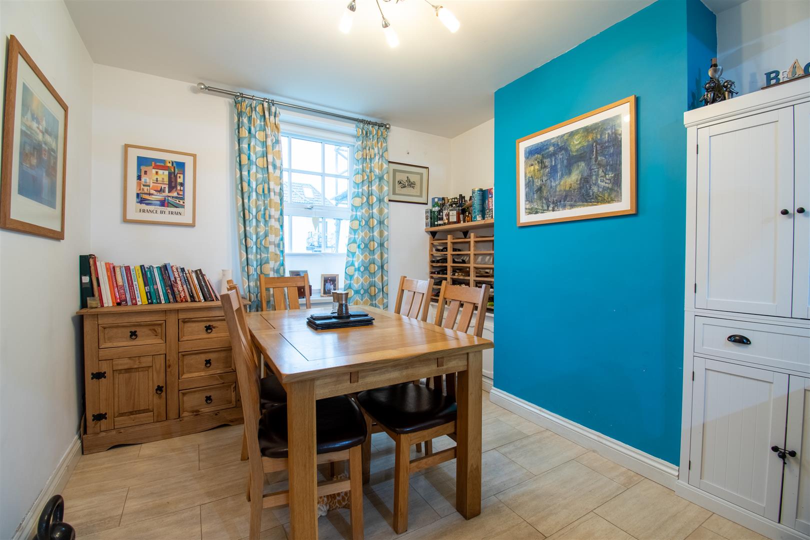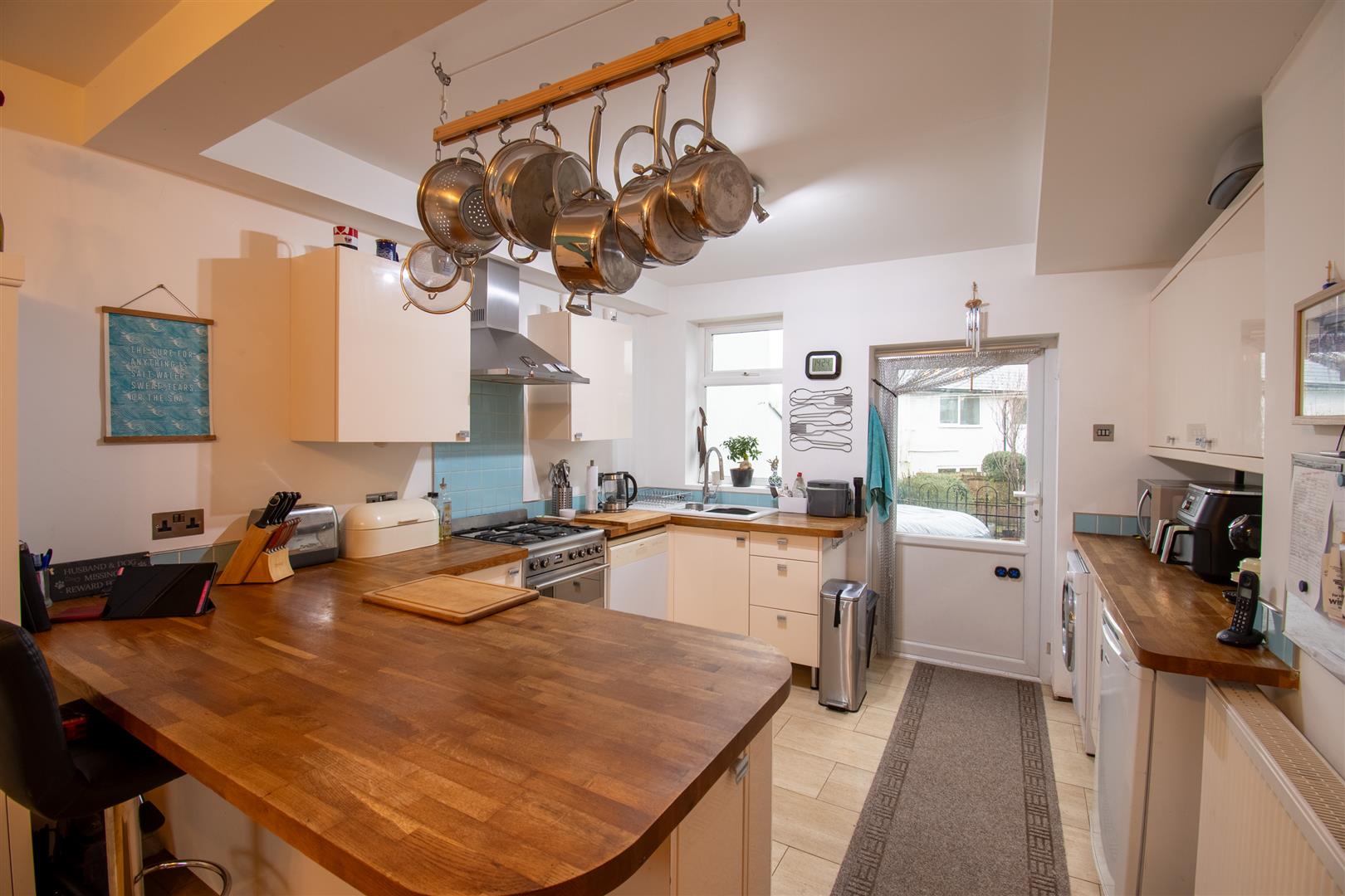 Smoothly plastered ceiling, smoothly plastered walls. Travertine tiled flooring. Wall mounted radiator. UPVC double glazed window to the front elevation. UPVC double glazed window to the rear. UPVC double glazed door leading out the rear garden. Fitted kitchen, comprising of wall and base units. Solid oak worktops. Porcelain tiled splashbacks. Belfast ceramic 1 1/2 bowl sink. Space for gas cooker. Stainless steel cooker hood. Space for washing machine, space for dishwasher, space for fridge. Through opening the dining area which provides ample room for dining furniture.