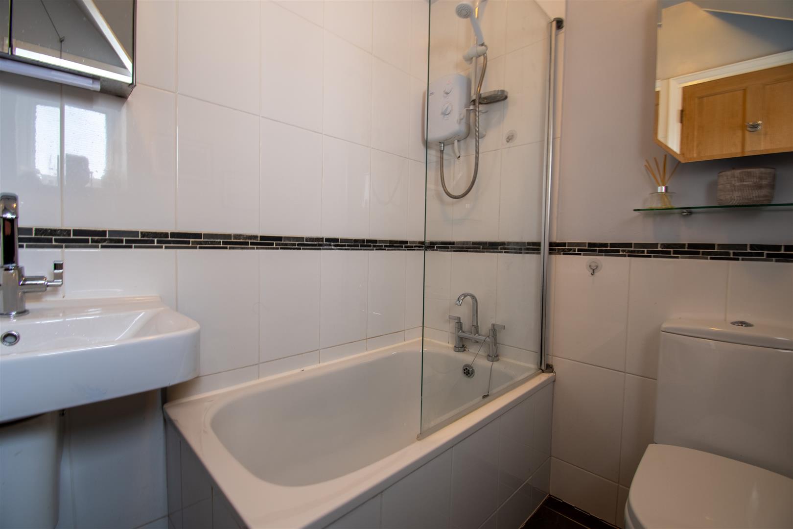 Smoothly plastered ceiling, smoothly plastered walls - Part porcelain tiled. Ceramic tiled flooring. Wall mounted radiator. Bath with electric shower overhead. Pedestal wash hand basin, close coupled toilet.