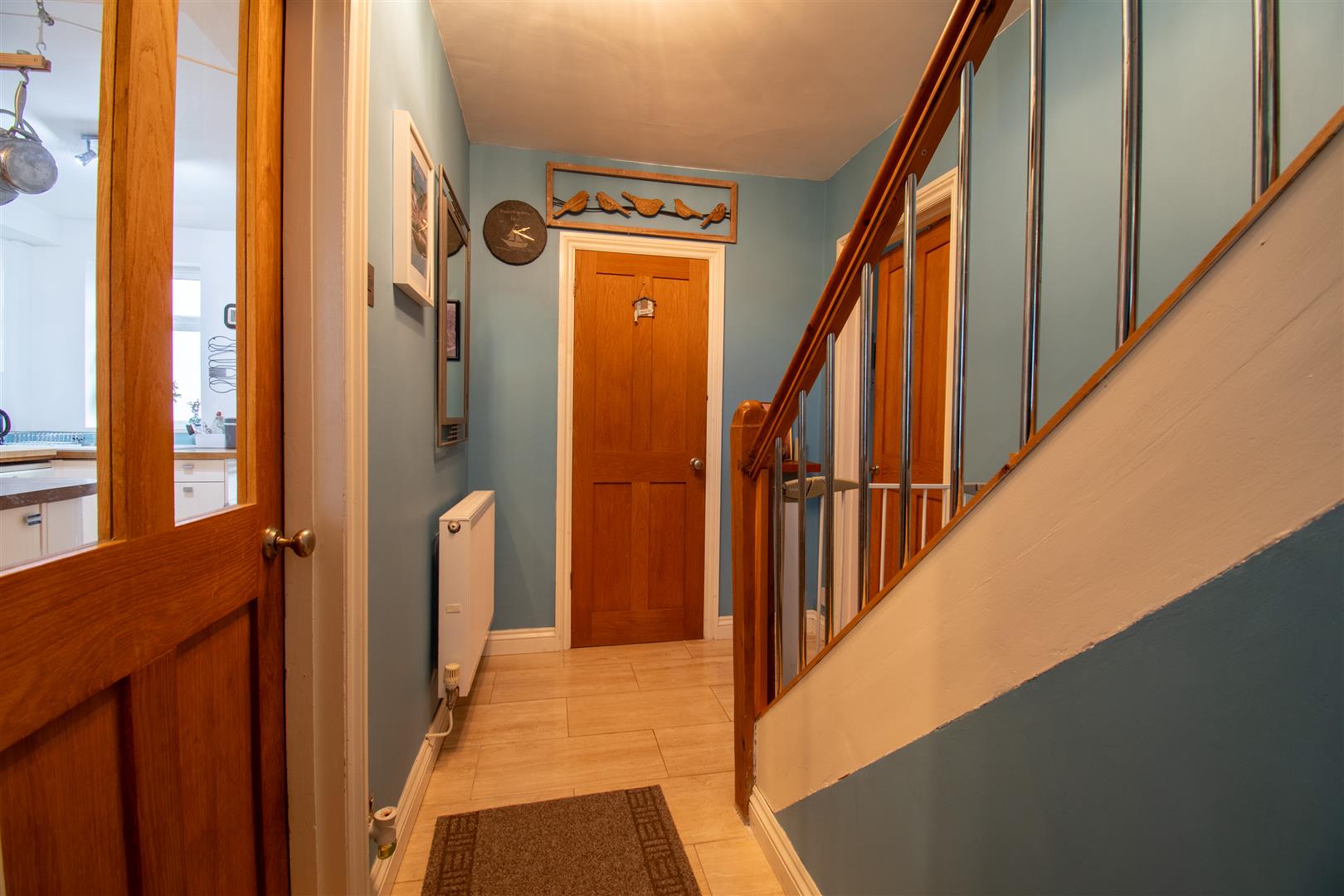 Smoothly plastered ceiling, smoothly plastered walls. Travertine tiled flooring. Wall mounted radiator. Wood panel doors leading to living room and W.C. Cloakroom. Wood framed door with glass insert leading through to kitchen / dining. UPVC double glazed door with obscured glass leading through to the entrance porch. Fitted carpet staircase rising to the first floor. Access to under stairs storage.