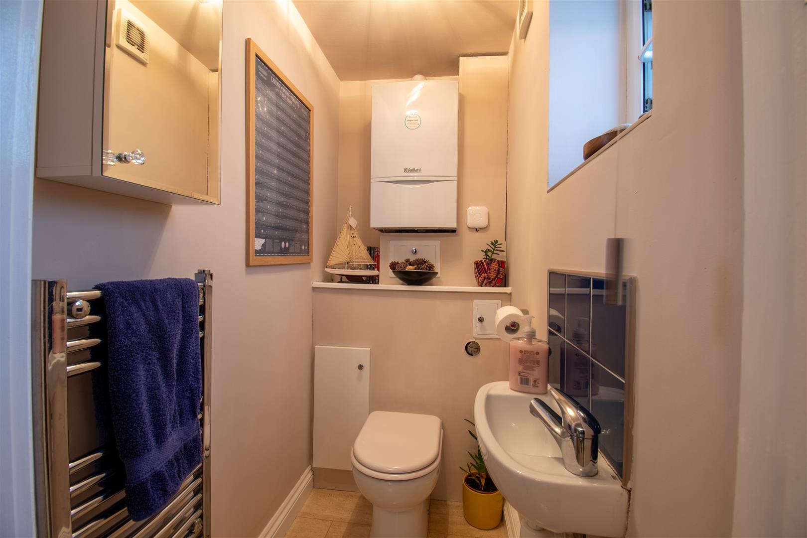 Smoothly plastered ceiling, smoothly plastered walls. Travertine tiled flooring. Wall mounted towel rail. UPVC double glazed window to the side with obscured glass. Wall mounted wash hand basin. Vanity, toilet. Wall mounted boiler. Wood panel door leading through to the entrance hallway.
