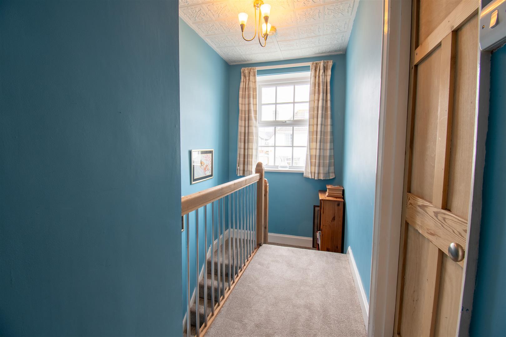 Polystyrene ceiling- part smoothly plastered with loft access via a pulldown fixed ladder. Smoothly plastered walls. Fitted carpet flooring. UPVC double glazed window to the front elevation. Wood panel door leading to bedrooms one, two and bedroom three. A further wood panelled door leading to the family bathroom. Access to storage.