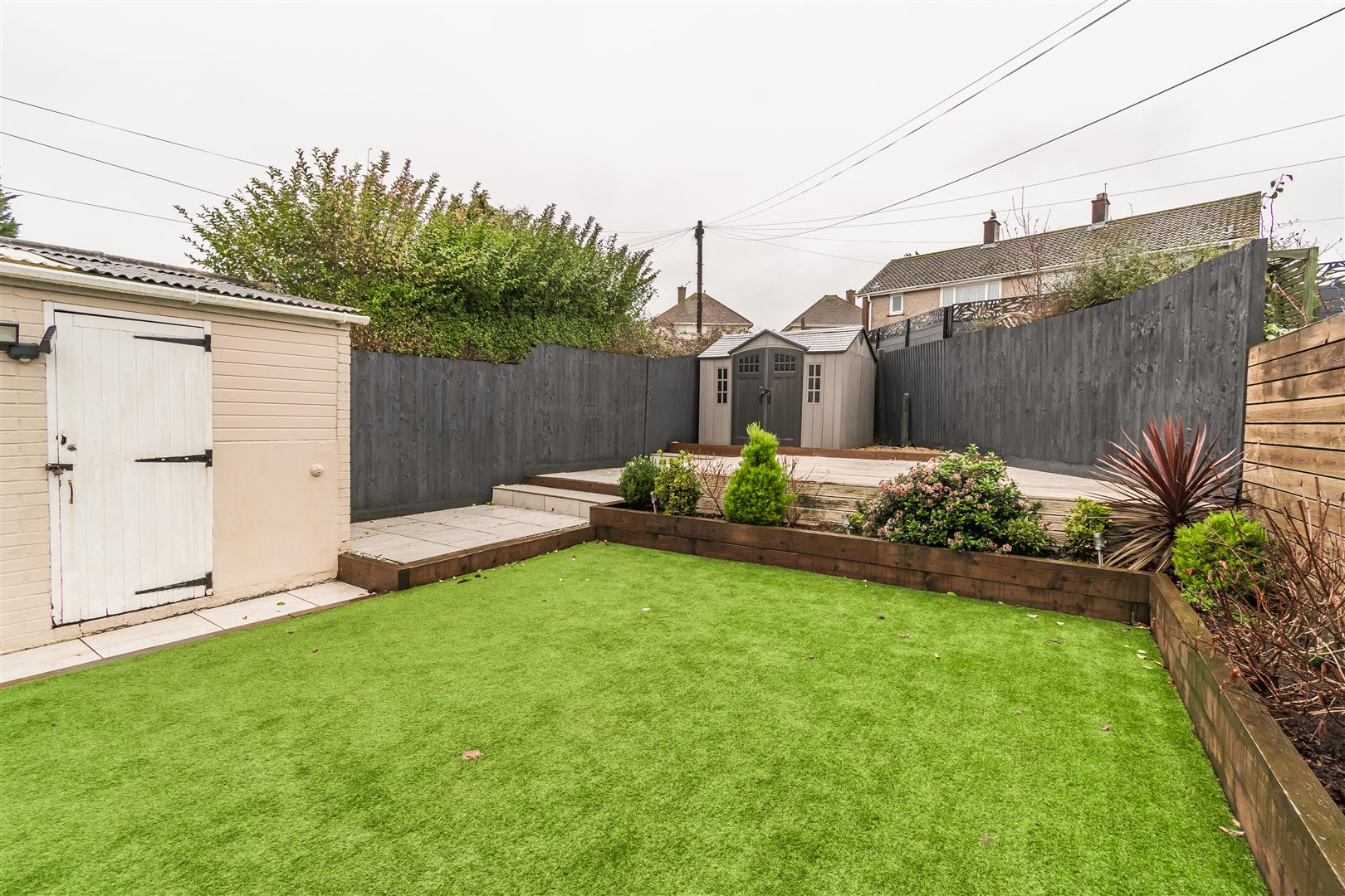 Enclosed rear garden. Porcelain tiled steps and pathway. Sleeper edging surrounding laid Astro turfed lawn area. Planted established shrubbery. Decked Patio area providing ample room for garden furniture. Summer house. Out door storage building with separate power and lighting.