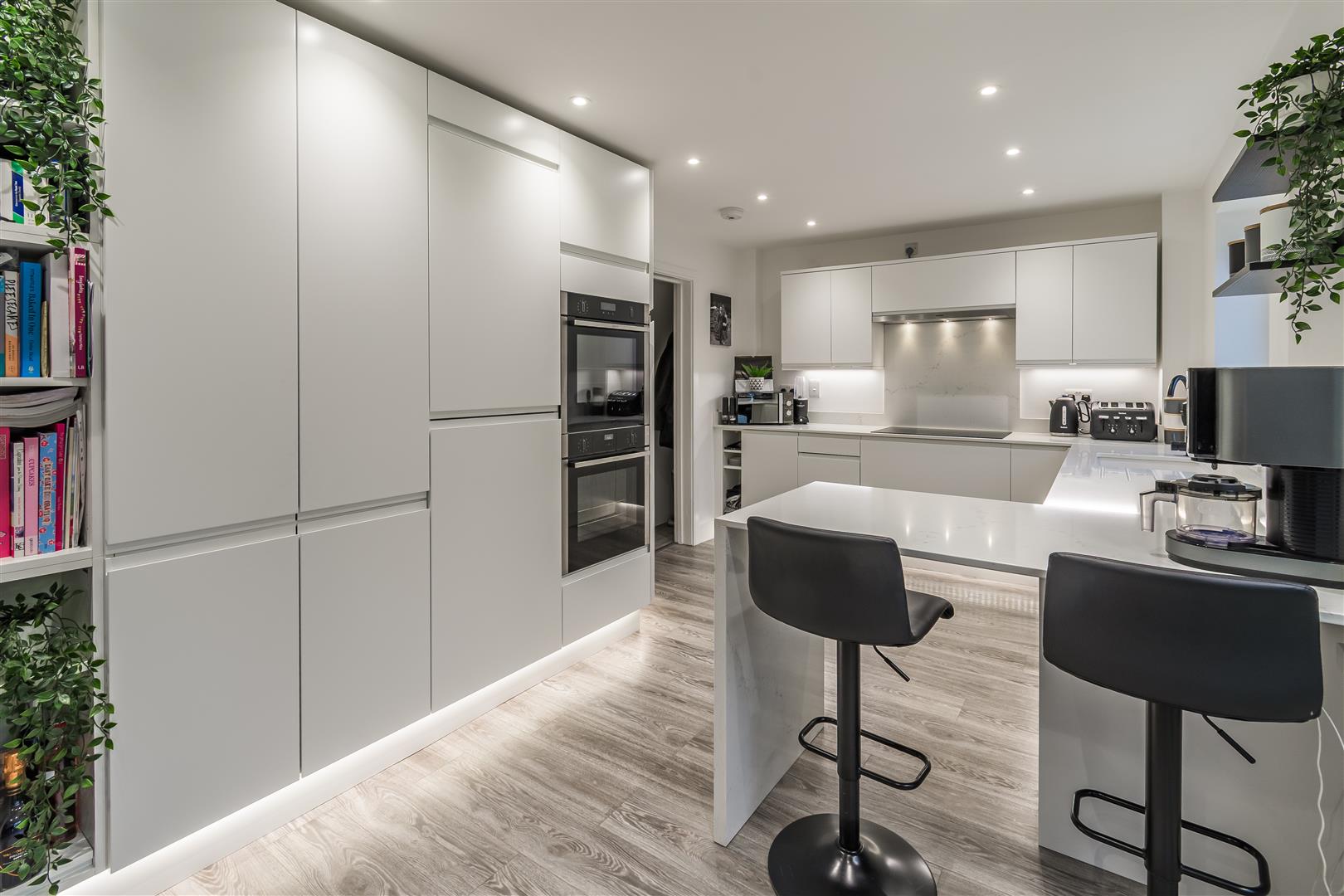 Smoothly plastered ceiling with inset lights, smoothly plastered walls. LVT flooring. UPVC double glazed window to the rear. UPVC double glazed patio doors leading to conservatory. Through opening to living room, through opening to entrance hallway. A modern fitted kitchen comprising of wall and base units. Quartz worktops, Upstands and Hob Panel. Integrated induction hob and hood. Integrated double oven. Integrated fridge / freezer, Integrated dishwasher and washing machine.