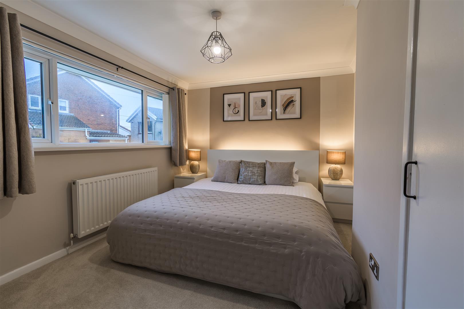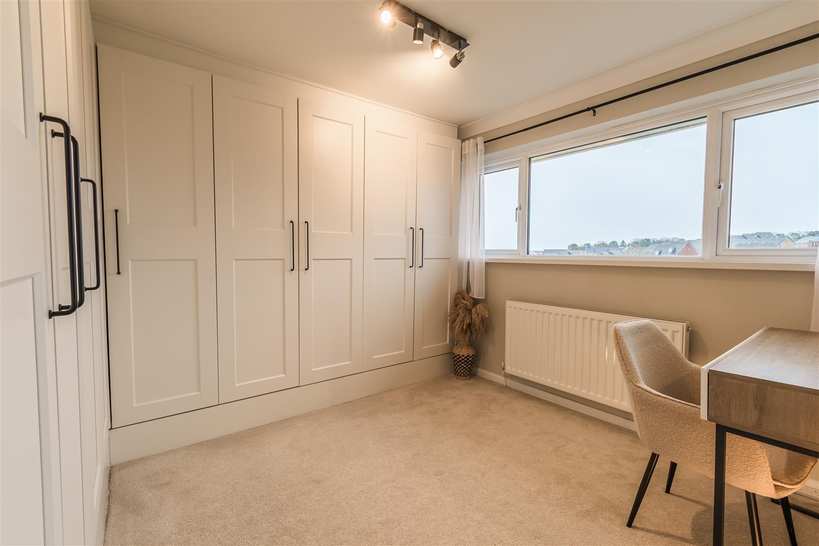 Smoothly plastered ceiling with coving, smoothly plastered walls. Fitted carpet flooring. Wall mounted radiator. UPVC double glazed window to the front elevation. Built-in wardrobes. Wood panelled door leading to the first floor landing.