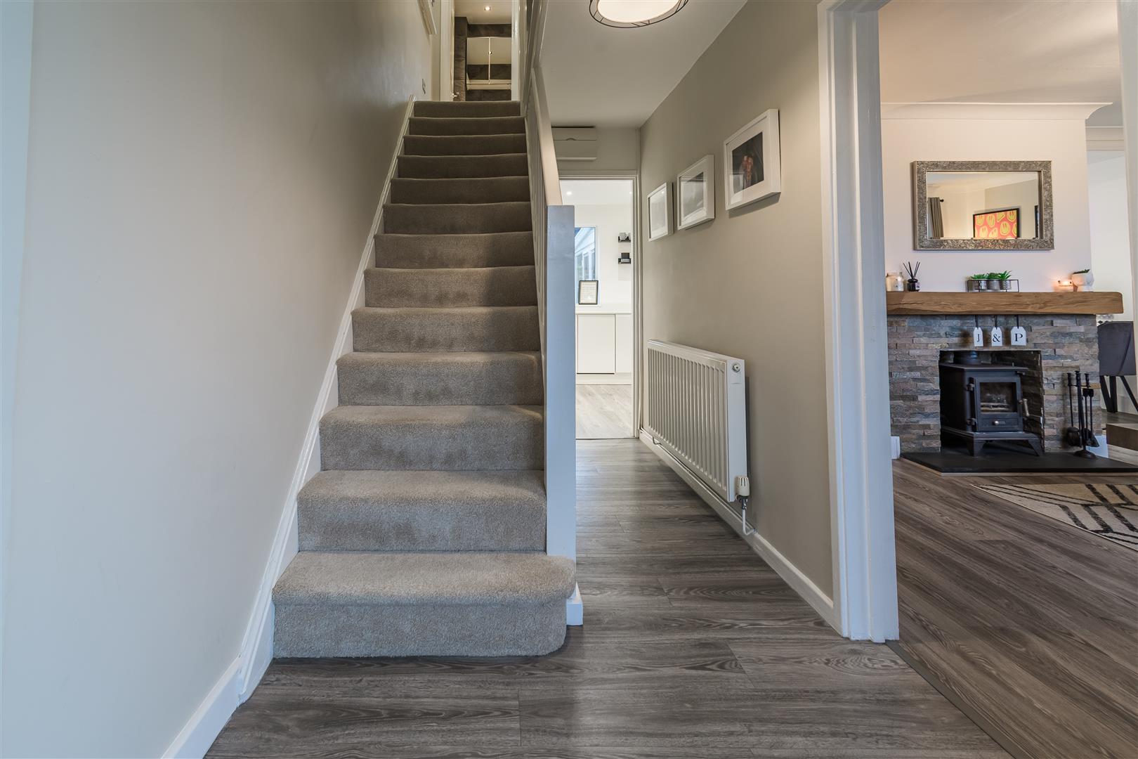 Smoothly plastered ceiling, smoothly plastered walls. LVT flooring. Wall mounted radiator. Fitted carpet staircase rising to the first floor. Through opening to the living room. A further through opening to kitchen / dining area.