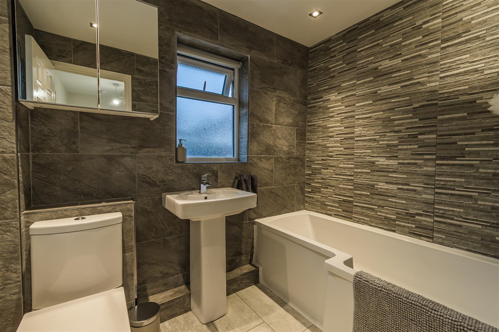 Smoothly plastered ceiling with inset lights and vent extractor. Ceramic tiled flooring and walls. Wall mounted towel rail. UPVC double glazed window to the rear and side elevations with obscured glass inserts. Pedestal wash hand basin. P shaped bath with thermostatically controlled shower overhead. Close coupled toilet. Wood Panelled door leading to the first floor landing.