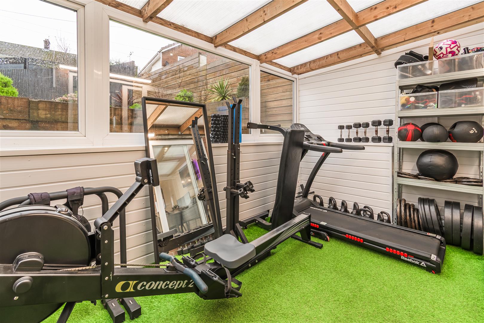 Polycarbonate roof. UPVC double glazed windows to the side and rear elevations. UPVC double glazed French doors leading out to the rear garden. Power & Lighting.