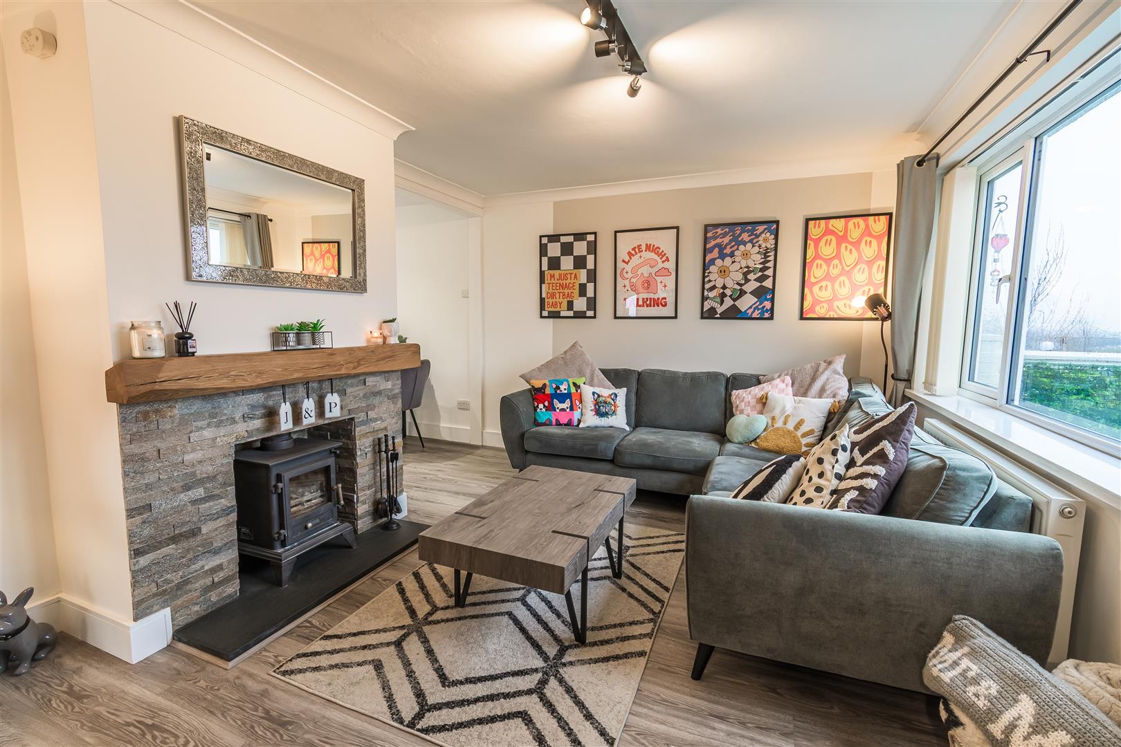 Smoothly plastered ceiling with coving, smoothly plastered walls. LVT flooring. Wall mounted radiator. UPVC double glazed window to the front elevation. Log burning stove. Through opening to the entrance hallway. Through opening to kitchen / dining.